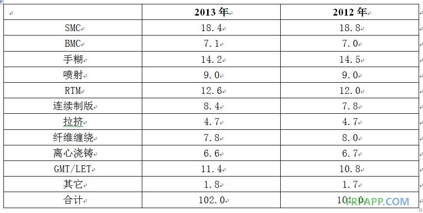 上表列出的GRP包括所有熱固性GRP以及玻纖氈增強塑料性塑料(GMT)和長纖維增強熱塑料塑料(LFT)。表中未包括短纖維增強熱塑性塑料。與2012年相同,GMT和LFT的市場趨勢顯著高于平均水平。這些產(chǎn)品的主要應用領域是汽車工業(yè)。熱塑性材料的制造商們不斷地在取代其它材料方面獲得成功,并開辟了汽車工業(yè)之外的新應用領域。