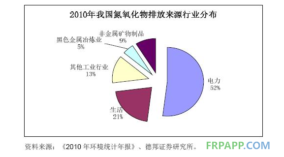 從氮氧化物排放來源來看,火電是最大的排放來源,根據2010年環境統計年報的數據,火電氮氧化物排放占比達到 52%,火電行業減排成績將極大地影響“十二五”氮氧化物減排目標實現與否。