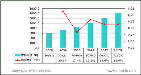 圖表1 2008-2013年我國碳纖維行業市場規模及增速