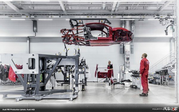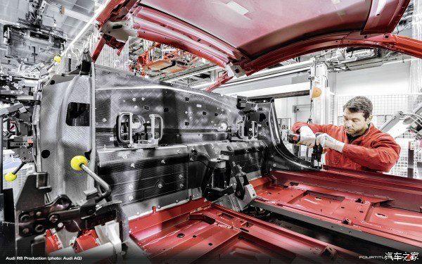 新 R8 是在德國的 Neckarsulm 奧迪工廠進行生產的,車身殼體運用了多種材料來進行輕量化。2014 年,奧迪對車身進行了小批量的生產來驗證輕量化研究。