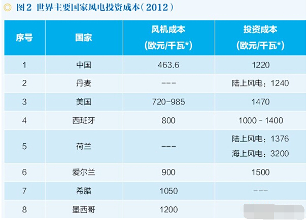 各國風(fēng)電成本差異顯著。各國環(huán)境差異顯著,發(fā)展規(guī)模不一,技術(shù)研發(fā)情況有所不同。在多種因素影響下,中國、美國、丹麥以及西班牙等風(fēng)電大國成本較低,而日本等國平均成本仍然較高。2012年,中國風(fēng)機平均成本為每千瓦436.6歐元,單位造價(即投資成本)為每千瓦1220歐元。相比之下,日本風(fēng)機成本為1740歐元/千瓦,造價為每千瓦2610歐元(海上風(fēng)電成本較高也是影響其他國家風(fēng)電成本較高的部分原因)。