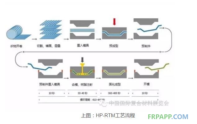 HP-RTM即高壓RTM,是在RTM成型工藝基礎(chǔ)上提高樹脂注射壓力和模壓成型壓力,同時匹配相應(yīng)的快速固化樹脂,成型過程中揮發(fā)成分極少、環(huán)境污染少,且生產(chǎn)效率高、自動化適應(yīng)性強(qiáng),可大大縮短零件的制造周期,適用于制造大批量高品質(zhì)的復(fù)合材料制品。