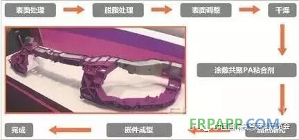 接下來將帶有共聚PA粘合劑膜的鋁合金放入模具,射出PA進行嵌件成型,前端模塊就完成了。成本與之前基本相同。因為省去了用螺絲連接金屬框架和樹脂部件的成本等。