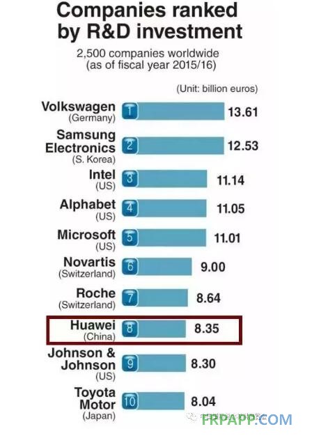 華為研發(fā)投入逐年遞增領(lǐng)跑中國廠商。作為電信設(shè)備制造商中的領(lǐng)頭羊,華為在中國廠商中研發(fā)上投入是最兇猛的。今年研發(fā)投入達到83.5億歐元(約合人民幣606億元),穩(wěn)居世界第八,其研發(fā)投入已超越豐田汽車。
