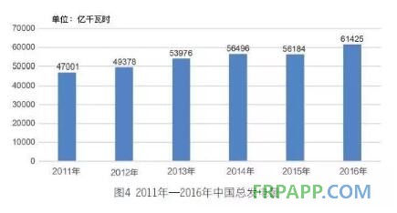 2015 年,我國總發電量為56184億千瓦時,同比下降0.2%,是近些年來首次出現下降。進入2016年,全國總發電量止跌回升,達到61425億千瓦時,同比增長5.6%,是2011 年以來的第三高位。