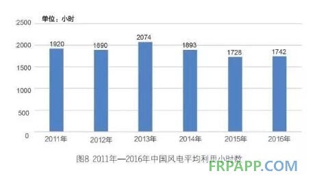 2016年,全國風電平均利用小時數為1742小時, 比2015 年的1728小時增加了14小時;比2014年的1893小時,則下降151小時。其中,平均利用小時數最高的省份是福建,達到2503小時;最低的為甘肅,為1088小時。