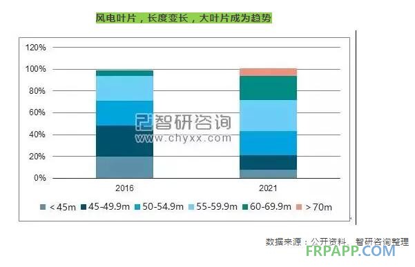 大葉片成為趨勢,全球的風電葉片長度目前以 45-59.9 米為主導,占比超過 70%,預計未來,到 2021 年,60-69.9 米的葉片占比將提升到 20%。