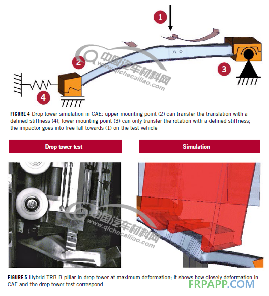 模擬表明,FRP材料應用于B柱上端,與鋼制結構通過粘合進行連接的方案最佳。上端采用高纖維含量的FRP材料,下端采用變厚度鋼制結構可獲得理想的減重和安全效果,具體如圖2所示。