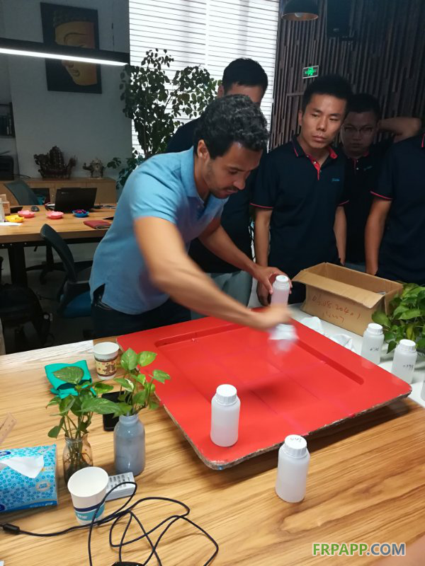 2018年9月5號上午法國技術專家剛剛抵達上海,下榻酒店稍作調整,就為我們做復材脫模劑的技術培訓,并且現場講解復材脫模劑的使用工藝。
