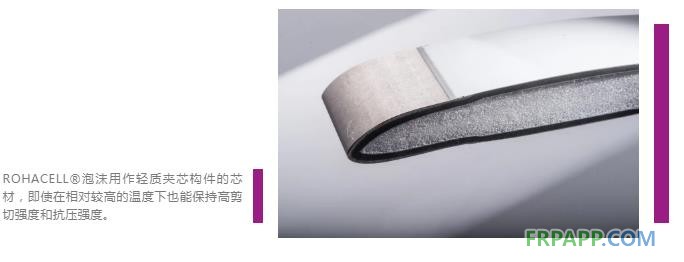 復合材料夾芯零部件集輕質芯材與超薄碳纖維復合材料覆蓋層于一體,能以最輕的重量提供最佳的機械性能。此外,ROHACELL®還具備優異的強度和剛度,能承受高達220℃(428℉)的高溫,并能在高溫下具有優異的抗壓縮蠕變強度。