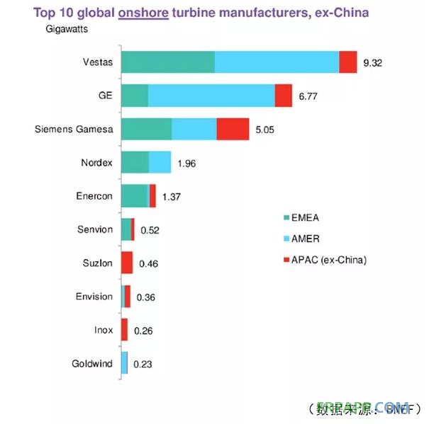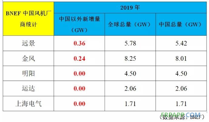日前,彭博新能源財經(BNEF)發布2019年全球風電整機商新增吊裝容量數據,經統計,2019年中國風機企業在海外的累計新增吊裝0.6GW。遠景能源以0.36GW的海外風機吊裝量,居于中國風電整機商海外新增吊裝量榜首。金風科技以0.24GW的海外風機吊裝量,居于第二。明陽、運達、上海電氣等設備企業未顯示有海外吊裝業績。