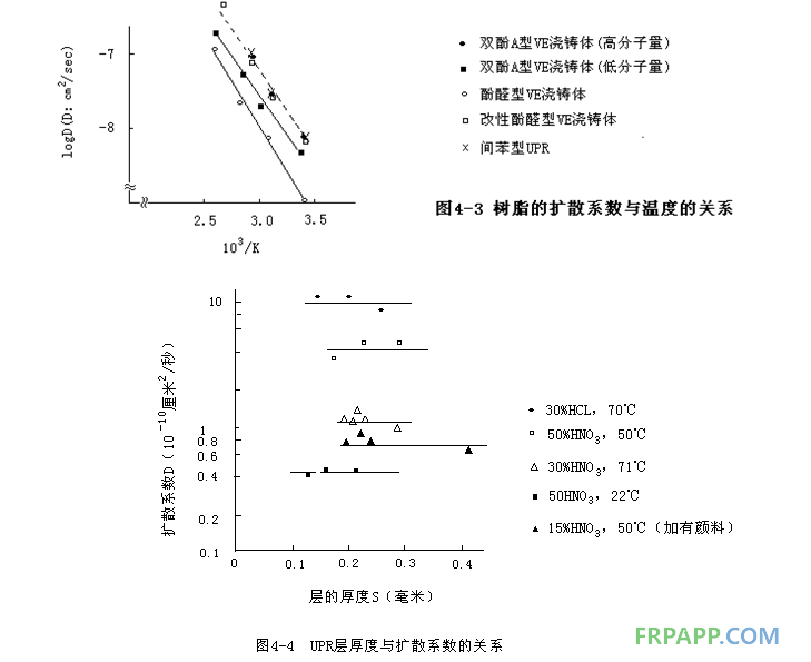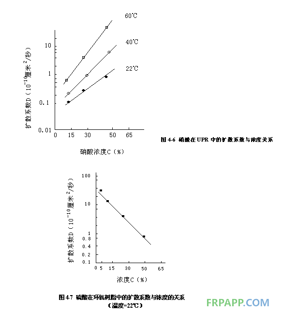 不僅限于FRP襯里,所有的有機襯里材料一接觸到液態化學介質、水、氣體即會擴散至材料內部,在一定時間后透過一定深度。關于擴散有Fick公式,作為理想的擴散公式,多數時候可求得擴散系數的大概值。擴散系數表示襯里材料對介質的吸收速度,是判斷防腐蝕襯里使用壽命的一個重要因素。