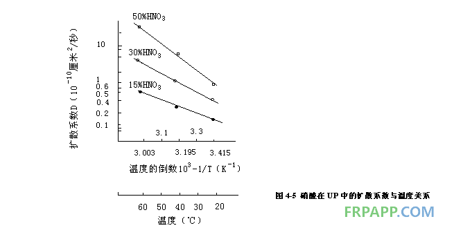 一般情況下,襯里層厚度對擴散系數沒有影響,如圖4-4;介質溫度對擴散系數的影響,基本符合阿論尼烏斯(Arrhenius)公式,如圖4-5;而介質濃度的大小與擴散系數有關系,如圖4-6和圖4-7。