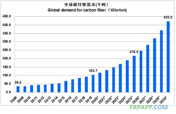 2019年,全球碳纖維經歷了60年的努力,把碳纖維的需求第一次做到10萬噸以上。這是碳纖維復合材料產業鏈的復雜性決定的。當絕大部分核心技術被人類掌握之后,下一個10萬噸的增長,時間會急劇縮短,我們預測2025年就會進入20萬噸,2030年會進入40-50萬噸。