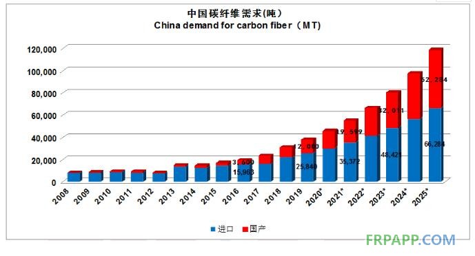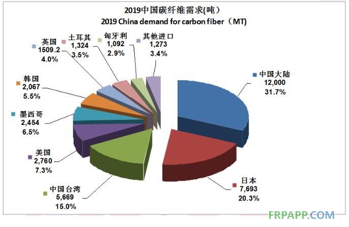 2019年中國碳纖維的總需求為:37,840噸,對比2018年的31,000噸,同比增長了22%,其中,進口量為25,840噸(占總需求的68%,比2018增長了17.5%),國產纖維供應量為12,000噸(占總需求的31.7%,比2018年增長了33%),2019年的中國市場的總體情況是:供不應求,無論是進口還是國產纖維。