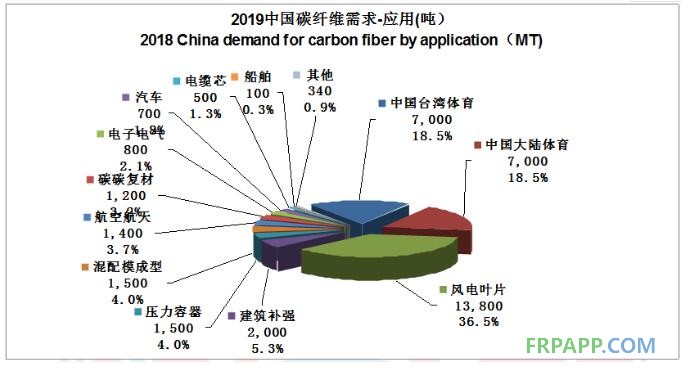 與2018年的特點類似,中國需求的超高增長的主要驅動者是風電葉片市場:2019年風電消耗13,800噸碳纖維,對比2108年的8,000噸,增長率72.5%。2019年用于風電的國產碳纖維大約有1,000噸,而2018年是全部進口。顯然,這幾年跳躍式增長的風電葉片用量(2017:3,060噸,2018:8,000噸,2019:13,800噸),給國內碳纖維企業帶來了難得的發展機遇。