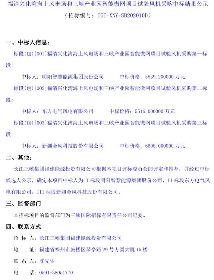 近日,福清興化灣海上風(fēng)電場(chǎng)和三峽產(chǎn)業(yè)園智能微網(wǎng)項(xiàng)目試驗(yàn)風(fēng)機(jī)采購(gòu)中標(biāo)結(jié)果公示,明陽(yáng)智能、東方風(fēng)電、金風(fēng)科技分別中標(biāo)。