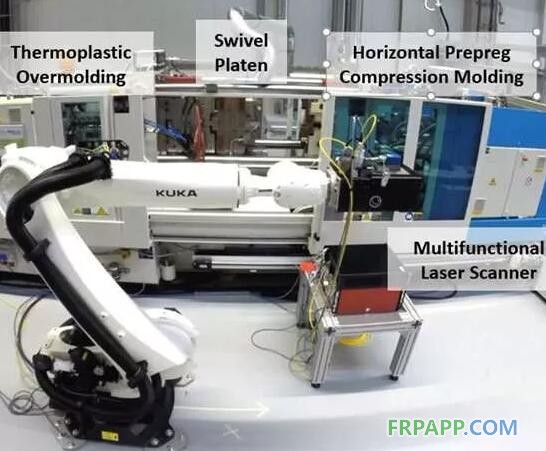 熱塑性-熱固性的混合生產:寶馬i3生命模塊地板的一部分,展示了一種大批量生產混合復合材料部件的成型單元,它利用中央水平轉模板來兼容熱固性預浸料的模壓成型和熱塑性塑料的二次成型,而光子學則提供了基本的部件參照(圖片來自亞琛工業大學AZL和Arges)
