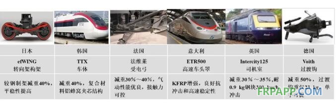 國外用于軌道交通裝備上的纖維增強復合材料多為碳纖維或玻璃纖維增強復合材料,其也經歷了從非承載結構到主承載結構的發展過程。典型的應用案例如:日本新干線N700系高速列車車體車頂、蒙皮、導電弓架邊緣和窗框采用碳纖維增強復合材料;日本川崎重工開發的“efWING”轉向架是全世界首例主承載結構采用碳纖維增強樹脂基復合材料的案例,將原來剛性焊接轉向架的構架改為柔性結構,減重達40%。韓國KTX-Ⅱ列車大量內裝采用了復合材料,之后韓國TTX擺式列車車體采用碳纖維復合材料制作,重量降低40%。歐美在軌道交通車輛纖維增強復合材料進化過程中也做出了很多探索,如英國Intercity125機車、意大利ETR500型高速列車、法國的AGVgap動車組、美國佛羅里達州的單軌列車等都不同程度地使用了纖維增強復合材料作為車輛的內飾、主承載結構或次承載結構,減重效果良好,各種性能測試均達標。