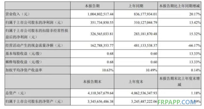 據(jù)了解,報(bào)告期內(nèi),公司實(shí)現(xiàn)營(yíng)業(yè)收入10.05億元,較上年同期增長(zhǎng)20.17%;歸屬于上市公司股東的凈利潤(rùn)3.52億元,較上年同期增長(zhǎng)13.42%;扣除非經(jīng)常性損益的凈利潤(rùn)3.27億元,較上年同期增長(zhǎng)15.32%。其中,