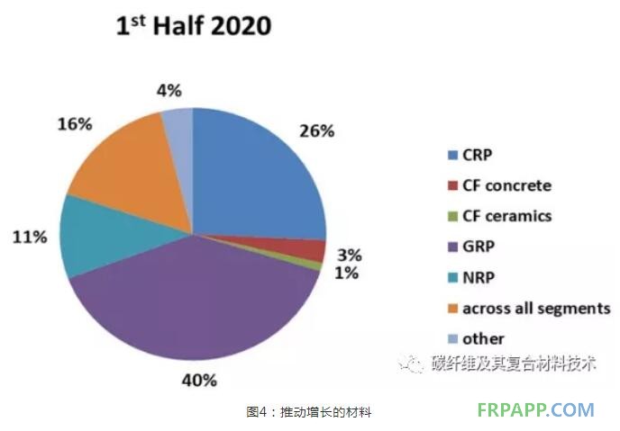 與上次調查一樣,復合材料領域的增長主要來自于全球范圍的增長。鑒于在前13項調查中,受訪者始終認為碳纖維增強塑料(CFRP)是復合材料領域增長最快的領域,其次是玻璃纖維增強塑料(GFRP)(見圖4),但總體規模上GFRP依舊處于領先地位