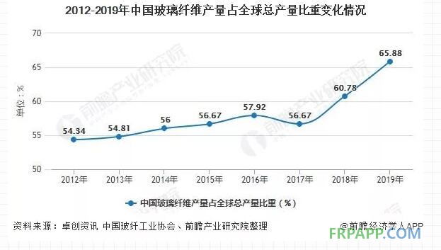 2012-2019年期間我國玻璃纖維產量占全球玻璃纖維產量比重呈現波動上升態勢。2012年,我國玻璃纖維產量占比為54.34%,2019年我國玻璃纖維產量占比上升至65.88%,七年的時間,比重提升了將近12個百分點,可見全球玻璃纖維供應增量主要來自中國,中國玻璃纖維行業在全球擴張速度較快,確立了我國在世界玻璃纖維市場中的龍頭地位。