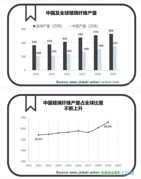 2008年全球經濟遭受到金融危機的抨擊,玻璃纖維行業也因此受影響。直到2010年,全球經濟開始復蘇,由此推動玻璃纖維行業的高速增長,2017年至今產能逐漸擴張。2018年,全球玻璃纖維產能達到770萬噸。2019年末,全球玻璃纖維產能實現800萬噸。