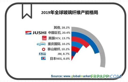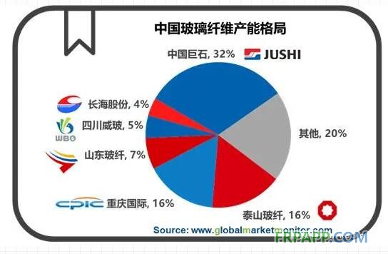 國內方面,中國巨石、泰山玻纖和重慶國際是國內玻纖行業的三大巨頭,合計產能共占全國總產能的64%,加上山東玻纖、四川威玻和長海股份,國內前六大供應商產能占比為80%。