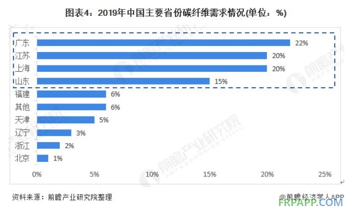 ——地區(qū)消費(fèi)金額:2019年廣東、江蘇、上海及山東地區(qū)對(duì)碳纖維消費(fèi)金額較大,合計(jì)占全國總需求的77%