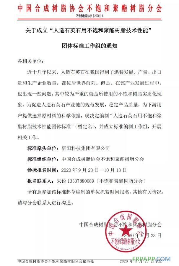 關(guān)于成立“人造石英石用不飽和聚酯樹脂技術(shù)性能” 團(tuán)體標(biāo)準(zhǔn)工作組的通知