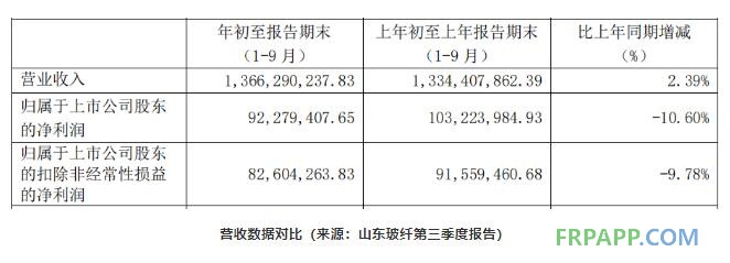 山東玻纖于今年9月3日登陸上交所主板,成功上市。從上市報告中可以看到,今年上半年的營收數(shù)據(jù)同比是下降的。跟行業(yè)老大一樣,通過第三季度的銷售,成功將營收變負(fù)為正。