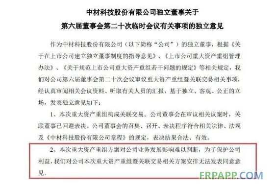 關(guān)于失敗原因,中材科技的公告中提到,獨(dú)立董事認(rèn)為本次重大資產(chǎn)重組方案對(duì)整合后公司業(yè)務(wù)發(fā)展影響難以判斷,為了保護(hù)公司利益,對(duì)本次重組方案投出反對(duì)票。