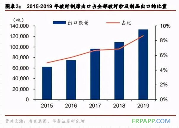 近年來,我國玻璃纖維制席出口占比不斷提升。根據海關總署,2019 年我國玻璃纖維織物/ 制席(氈類)出口數量分別為 22.21/13.33 萬噸,同比增長 11%/22%,占我國全部玻纖及制品出口量的比重約 14.4%/8.7%。從近年來的變化趨勢來看,織物出口占比基本保持穩定,而制席占比在逐年提升,2019 年相較 2015 年已提升 3.7%,反映了我國制席在國際市場上的產品競爭力在不斷增強。未來隨著我國生產工藝的不斷成熟以及產能的擴張,預計我國玻纖制品的出口占玻纖紗及制品整體的比重仍會持續提升。