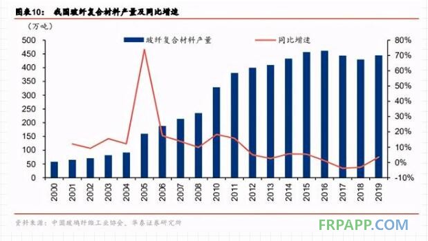 2019 年我國玻纖復合材料產量 445 萬噸,未來仍有較大發展空間。復合材料是指由兩種及以上不同物質以不同方式組成具有新性能的材料,是新材料領域的重要組成部分。復合材料一般由兩種材料構成:增強材料與基體材料。增強材料包括玻璃纖維、碳纖維、芳綸纖維等。基體材料的作用是將增強材料粘接成固態整體,保護增強材料,傳遞載荷,阻止裂紋擴展,包括樹脂基、金屬基、陶瓷基和水泥基。在復合材料中,樹脂基玻纖增強復合 材料是目前全球產量最大、應用最廣的復合材料,約占復合材料的 90%。2019 年我國玻纖復合材料產量達 445 萬噸,同比增長 3.5%,在行業經歷 2017~2018 年環保督察及規范管理轉型后,行業競爭秩序逐漸好轉,未來隨著產品不斷創新,應用領域不斷拓寬,玻纖復合材料仍有較大發展空間。根據國外機構 Markets and Markets 預測, 全球復合材料市場規模將從 2020 年的 740 億美元增長到 2025 年的 1128 億美元,年復合增長率達 8.8%,其中玻纖復合材料占比預計在 80%以上。