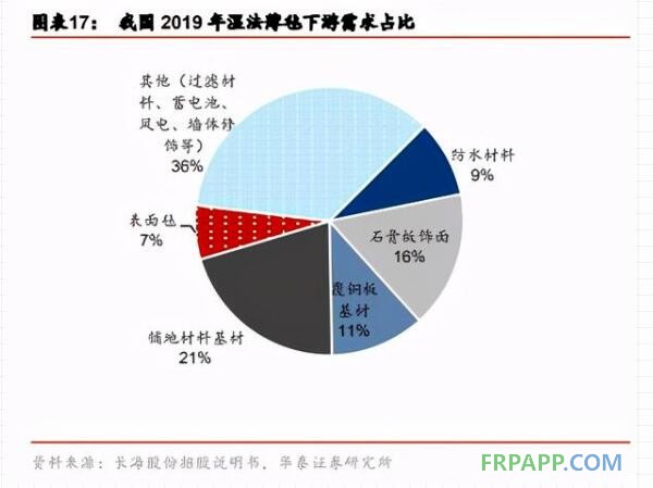 估算我國 2019 年濕法薄氈整體產量約 10 億平。除上述應用領域外,濕法薄氈還廣泛應用于壁紙基材、墻體增強、鉛酸蓄電池隔板、過濾材料等領域,根據長海股份招股說明書, 我國 2009 年我國濕法薄氈產量約 3.4 億平,考慮到隨著技術不斷進步,帶動濕法薄氈產 品向更輕薄方向發展,因此單位玻纖紗所生產的薄氈面積將更大,預計濕法薄氈產量 增速快于玻纖紗產量增速,估算 2019 年我國濕法薄氈產量約 10 億平。測算下游鋪地材料 /石膏板飾面 /覆銅板基材 /防水材料 /玻璃鋼表面氈領域需求占比分別為 21%/16%/11%9%/7%,其他如濾材、風電葉片表面處理、墻體修復等領域合計約 36%。