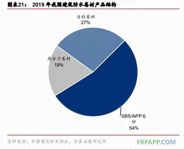 目前我國防水材料主要有傳統的瀝青油氈類防水卷材以及 SBS/APP 改性瀝青防水卷材、 高分子防水卷材、防水涂料、自粘防水卷材、玻纖瀝青瓦和其他新型防水材料等。建筑防水材料中防水卷材占比最大,占比達到 63.76%,防水卷材中 SBS/APP 改性瀝青防水卷材占比達到 54%。