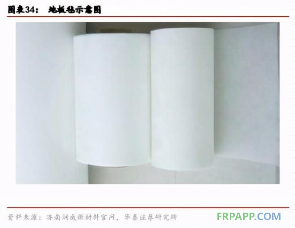 預計我國 PVC 地板中薄氈需求約 0.73 億平。普通 PVC 地板由于添加了較多的填充材料而使得強度較低,脆性較大,且由于 PVC 材料特性的影響容易引起熱脹冷縮,在家庭和公共場所的使用過程中會出現起拱,拼接縫隙變大難以修復而影響使用。PVC 地板生產廠家通過在 PVC 地板中加入玻纖穩定層,來降低地板的膨脹率,提高穩定性,濕法薄氈由于單位面積重量輕,強度高,氈面細膩平整,涂層均勻,且易與 PVC 材料進行熱貼合,從而是最佳增強材料之選。目前玻纖增強材料在 PVC 地板中的使用率仍不高,主要 用于一些高端產品中,根據產業信息網預測,目前玻纖氈在 PVC 地板中的滲透率約 10%, 按此比例測算,則我國 PVC 地板中薄氈的用量約在 0.73 億平。