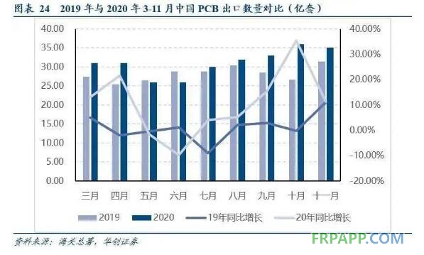 2020年7-11月,中國PCB出口數量同比顯著增長,尤其是10月同比增長35.79%,可能主要下游行業復蘇需求增加,以及疫情之下海外PCB工廠供給能力不穩定,中國大陸企業承接海外轉單。
