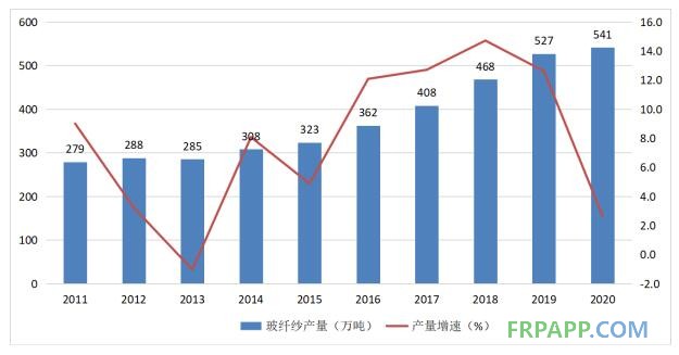 1.玻璃纖維紗:產量增幅顯著回落    2020年實現玻璃纖維紗總產量541萬噸,同比增長2.64%,增速與去年相比出現明顯回落。盡管新冠肺炎疫情對全球經濟造成重大沖擊,但得益于2019年以來全行業產能調控工作持續推進,以及內需市場及時復蘇,未形成較大規模的嚴重庫存積壓。進入三季度,隨著風電市場需求快速增長,以及基建、家電、電子等領域需求逐步回暖,玻纖紗市場供需形勢發生根本轉變,各品種玻纖紗價格逐步進入快速上升通道。