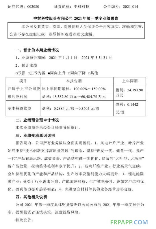 中材科技3月6日發布2021年第一季度業績預告,預計歸屬于上市公司股東的凈利潤48,387.80 萬元~60,484.75 萬元,同比增長:100~150%;基本每股收益盈利:0.2884元/股~0.3605元/股。