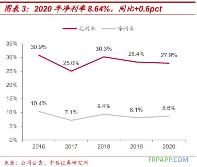 利潤端:2020年全年歸母凈利同增17.8%;毛利率27.92%,同比-0.4%(毛利率下降主因適用新收入準則后原部分銷售費用重分類至營業成本所致);期間費用率16.45%,同比-2.9%;凈利率8.64%,同比+0.6%。
