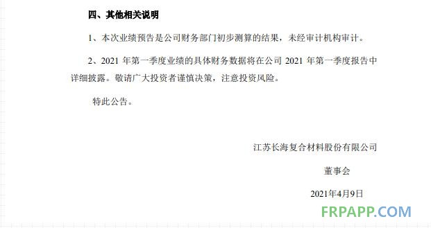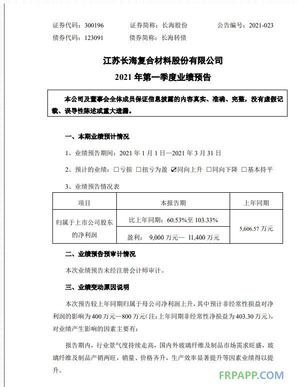 復合材料股份有限公司發布了 2021 年第一季度業績預告,業績預告中指出,歸屬于上市公司股東的凈利潤比上年同期上升:60.53%~103.33%,盈利:9000 萬元~11400 萬元。