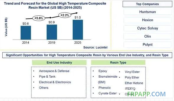 根據Lucintel公司發布的《High Temperature Composite Resin Market Report: Trends, Forecast and Competitive Analysis》,預計2025年全球復合材料用高溫樹脂體系的市場規模可達10億美元,其中2020年到2025年的年復合增長率為1%~3%。
