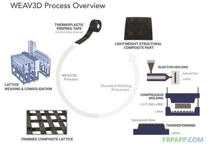 客戶可根據(jù)最終產(chǎn)品的要求,用不同的后續(xù)工藝對網(wǎng)格結(jié)構(gòu)進(jìn)行再加工。如果部件形狀相對簡單,可以直接鋪層熱成型;如果稍有難度,可以模壓成型;如果高度復(fù)雜,可以先做成預(yù)制件,然后復(fù)合模塑成型。