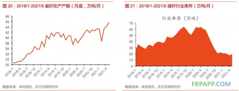 玻纖在產產能上升,庫存上升。5月末,玻纖在產產能45.59萬噸/月(上月末44.12萬噸/月),環比上升3.3%;玻纖行業庫存19.5萬噸(上月末17.4萬噸),環比上升12.1%。截至5月末,國內玻纖在產產能551.8萬噸(年化),較4月末增加15萬噸,主要為中國巨石桐鄉智能制造3線15萬噸產能(以合股紗為主)點火。截至5月末,玻纖庫存19.5萬噸,環比提升2.1萬噸。