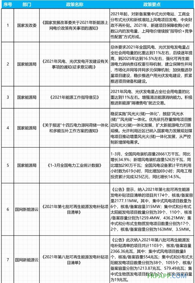 風(fēng)電行業(yè)屬于國家產(chǎn)業(yè)政策重點鼓勵發(fā)展的行業(yè),國家發(fā)改委、國家能源局等政府部門出臺了一系列產(chǎn)業(yè)支持政策。據(jù)統(tǒng)計,2021年共出臺7項國家政策,核心內(nèi)容如下: