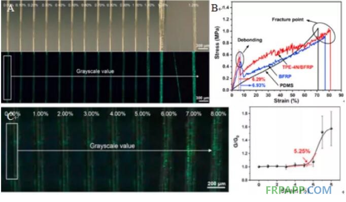 科研人員將上述纖維包埋在柔性高分子基體(聚二甲基硅氧烷,PDMS)基體中,制備出玄武巖纖維增強FRP試樣(BFRP),并探究其在拉伸條件下的熒光行為。研究顯示,TPE-4N/BFRP試樣的脫粘應變(6.29%)與BFRP試樣的脫粘應變(6.93%)基本相同(圖B),表明在界面處引入TPE-4N對BFRP的力學性能的影響較小。TPE-4N/BFRP試樣在拉伸應變達到5.25%時,出現了灰度值的突變(圖C),早于其完全脫粘時的應變(為6.29%),表明TPE-4N可用于BFRP材料的早期界面脫粘預警檢測。檢測BFRP材料熒光信號的強弱,即可評價相應材料的健康狀況,該方法為實時預測材料的壽命提供了新途徑。