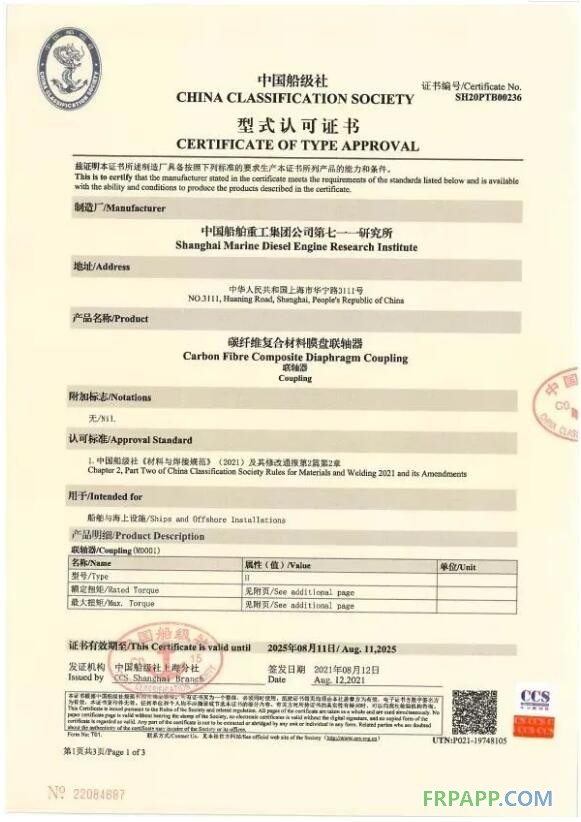 近日,由中國船舶集團七一一所研制的H型碳纖維復合材料膜盤聯軸器打破國外技術壟斷,成功獲得中國船級社(CCS)頒發的國內首張型式認可證書。