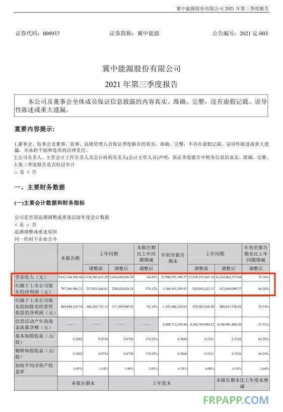 核心提示:冀中能源2021三季報顯示,第三季度,公司主營收入90.12億元,同比上升60.45%;歸母凈利潤7.07億元,同比上升174.12%;前三季度營