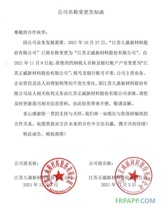 中硅會玻纖分會/全國玻纖情報網 常務理事單位——九鼎新材發布公告,因公司發展需要,10月27日已將公司名稱變更為“江蘇正威新